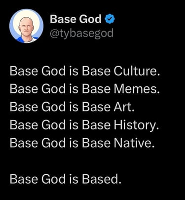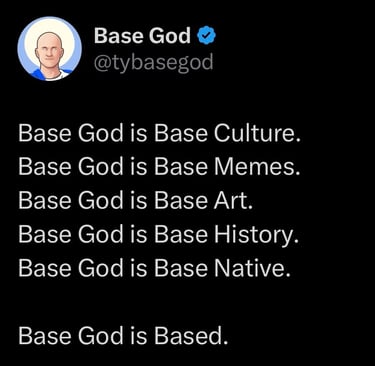 Any association of Base God with real life people and companies is purely coincidental. Base God, the TYBG token, and the Base Gods NFT collection is a parody meme cryptocurrency project with no intrinsic value or expectation of financial return. The Base God project is 100% community led and there is no formal team or roadmap. This is a meme project and its tokens have the potential to become totally useless.