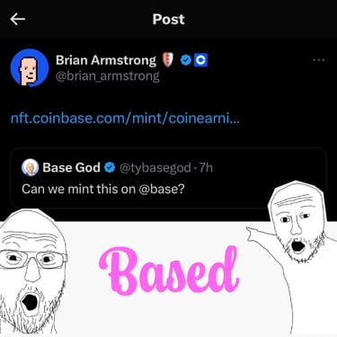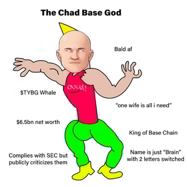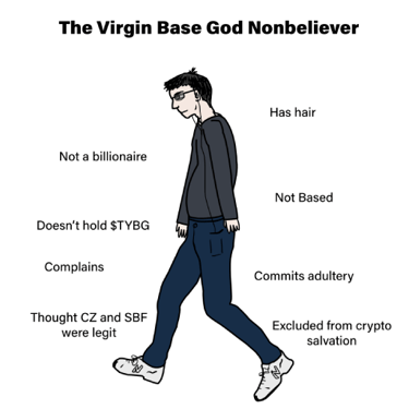 Any association of Base God with real life people and companies is purely coincidental. Base God, the TYBG token, and the Base Gods NFT collection is a parody meme cryptocurrency project with no intrinsic value or expectation of financial return. The Base God project is 100% community led and there is no formal team or roadmap. This is a meme project and its tokens have the potential to become totally useless.