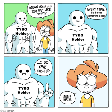 If $TYBG tokens are the body of Big B, memes are His blood. We encourage all disciples to keep their meme activity onchain, via our mintboard here. This allows your creations to live onchain and be mintable by other disciples, and gives you ETH rewards in the process.